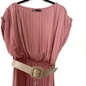ZARA Rose Pink Marsala Pleated Midi Belted Dress Size Large NWT
