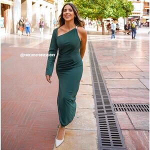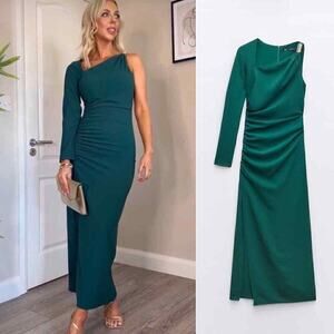 Midi dress with asymmetric neckline. One long sleeve and one strap with metal piece. Ruched fabric. Side slit at hem. Back hidden in-seam zip closure. From ZARA, in size M. New with tags. Sold out in stores.