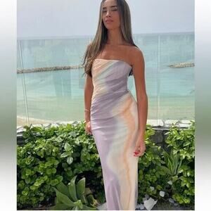 BLOGGER FAVE!!! Multicolored strapless midi dress with straight neckline. Ruched fabric. Hidden in-seam zip closure. From ZARA, in size L. New with tags. Sold out in stores.
