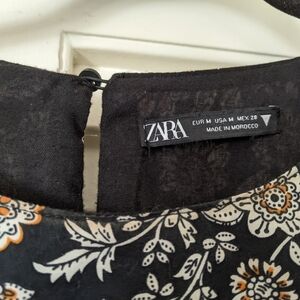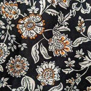 Black baby doll dress with ruffle collar, white and golden yellow floral design, puffed 3/4 sleeves and inner black lining. Great for Fall!