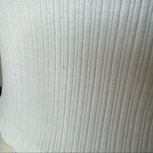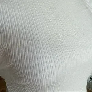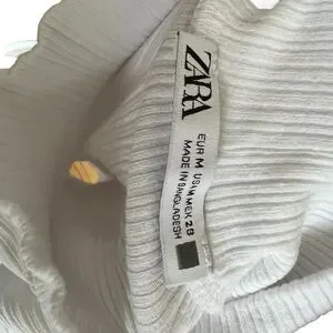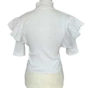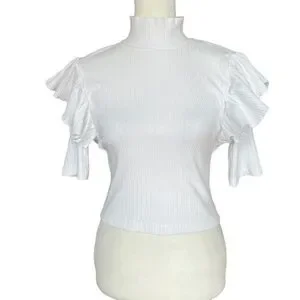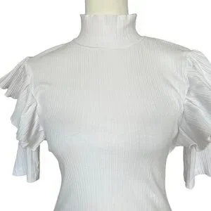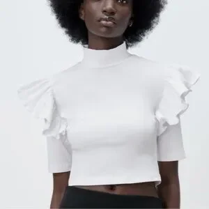 Turtle neck, ribbed tee with ruffle detail at shoulders.