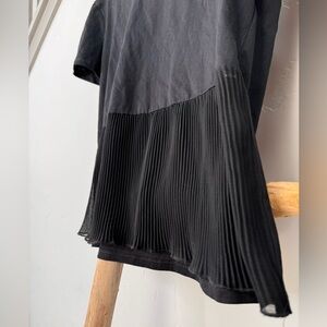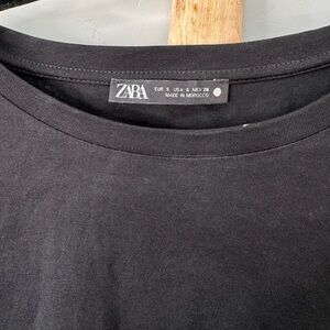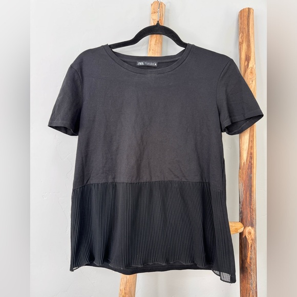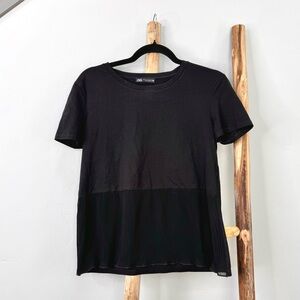 Black short sleeve tee shirt from ZARA. The front bottom half of shirt is a sheer paneled ruffle! Instantly elevates a classic casual look, super flattering!