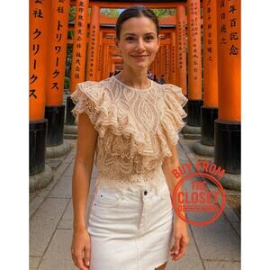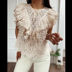 Romantic cream/beige lace top with dramatic front ruffle detail. Short sleeves, round neckline, back button closure. Intricate lace pattern — sold out everywhere.