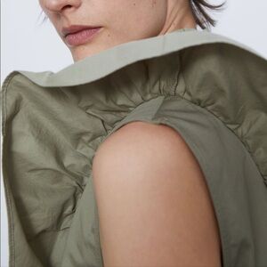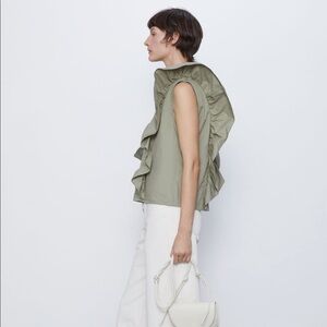 Sleeveless blouse with high collar. Tonal ruffle appliqué. Back hidden in-seam zip closure.