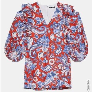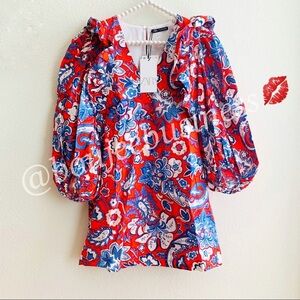 V-neck and below the elbow length balloon sleeves. Ruffle detail. Interior lining. Back opening and button closure. 100% Cotton, Lining: Polyester/Cotton