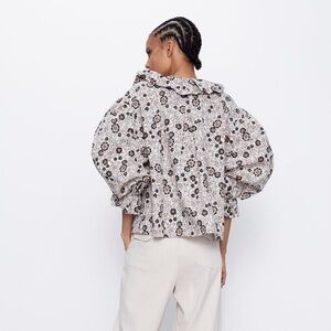V-neck top with long sleeves and elastic cuffs. Tonal matching ruffles. Front button closure. 100% Cotton