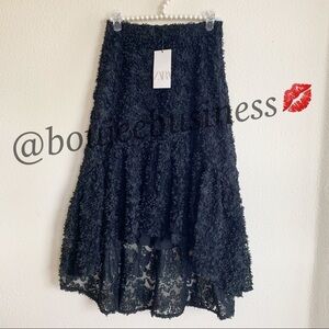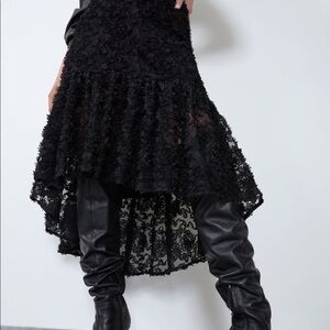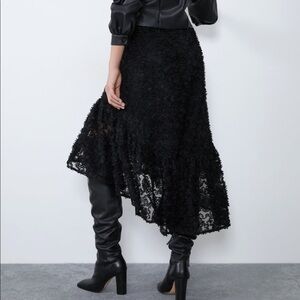 High waisted skirt with tonal appliqué. Interior lining. Ruffled asymmetric hem. Side zip closure.