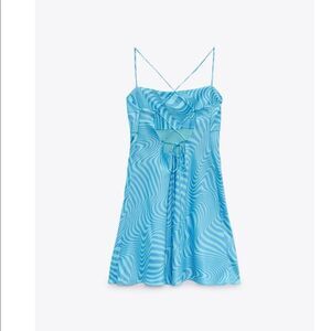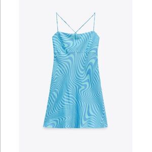 Mini dress with flowy neckline and adjustable spaghetti straps that cross and tie at back. Contrasting interior lining. Side hidden in-seam zip closure.