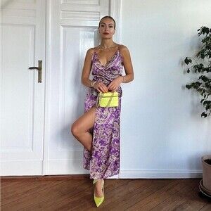 Midi dress with V-neckline and spaghetti straps. Wrap closure with self belt.
