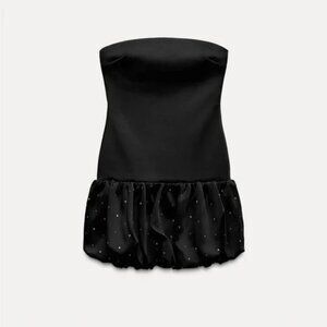 Strapless mini dress with straight neckline with balloon hem and rhinestone appliqué. Interior lining. Invisible back zip closure.