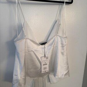 V-neck top with adjustable spaghetti straps. Front tie closure.