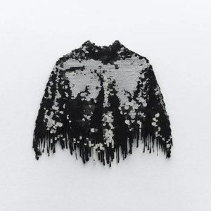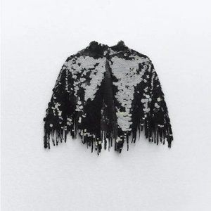 Crop cape with high collar and short sleeves. Sequin appliqués. Back opening with metal hook closure.