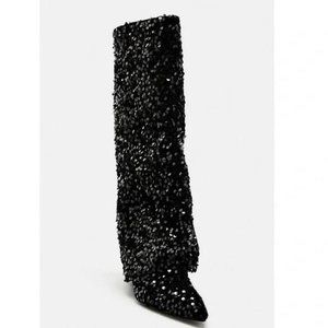 Velvet knee high boots with sequins. Gaiter detail. Pointed toe.