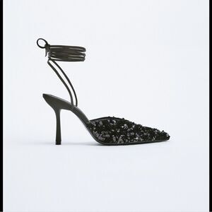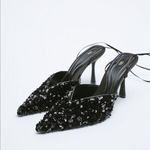 Open back high heels with sequins. V-shaped vamp. Elongated toe. Tied closure.