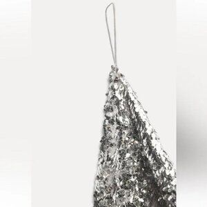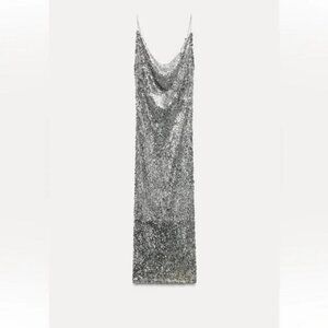 Midi dress with flowy neckline and spaghetti straps. Sequin appliqués.