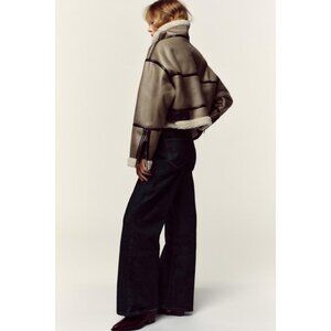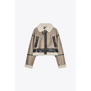 Lapel collar jacket with long sleeves and buckle tabs. Front zip pockets. Hem with belt. Combined fabric detail with faux shearling. Front zip closure.