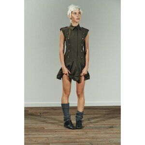 Short lapel collar dress. Sleeveless with shoulder pads and tabs. Marked seams and button detailing on the front. Ruffled hem. Tonal lining. Front zip and button closure.