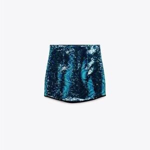 High-waisted short skirt with sequins appliqué. Asymmetric hem. Contrasting piping. Hidden in-seam zip closure.