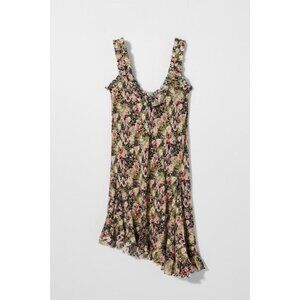 Short dress made from 100% spun silk. Round neckline and wide straps. Floral print detail. Asymmetric hem finished with ruffles.