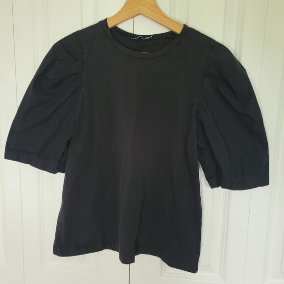 ZARA SIZE SMALL SHORT PUFF HALF SLEEVE BLACK TOP COTTON BLOUSE ROUND NECK BASIC