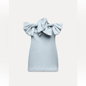 Off the shoulder short dress with elasticized straight neckline. Maxi bows detail. Tonal interior lining. Back hidden in-seam zip closure.