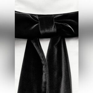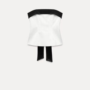 Strapless top with straight neckline. Contrasting velvet bow at back. Interior lining. Hidden zip closure at side.