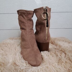 Sand-coloured heeled ankle boots. Stretch upper. Round wood-effect heels. Gold-effect maxi ring zip pull on the back.