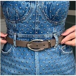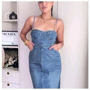 Midi dress with sweetheart neckline and thin straps. Belt loops. Front pockets. Stud appliqués. Frayed hem. Back metal zip closure.