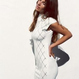Mini dress made of knit fabric. Mock neck and short sleeves. Stud appliqués.