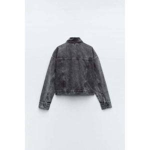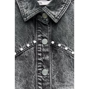 Jacket with lapel collar and long sleeves. Metal studs. Washed effect. Hidden in-seam front pockets. Front button closure.