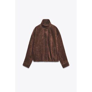 Jacket crafted from 100% suede leather. High neck and long sleeves with cuffs. Side pockets. Elasticated hem. Front zip fastening with a placket and hidden buttons.