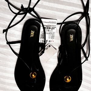 ZARA Sandals Black Wrap with Gold Tone Accent Size US 7 1/2 NWT