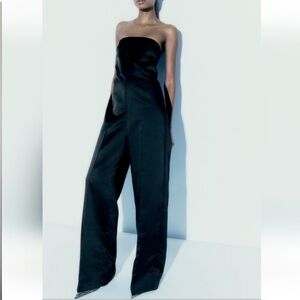 ZARA Satin Effect Long Jumpsuit Jewel Rhinestone Wide Leg Black