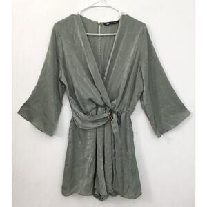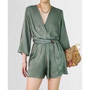 ZARA Satin Wide Sleeve Overlap Belt Detail Stretch Waist Romper in Green Sz M