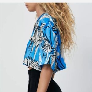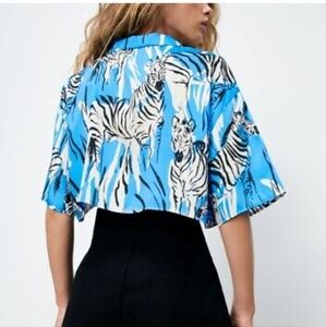 ZARA Satin zebra printed Cropped Button Up Short Sleeve In blue/wht/blk. Size XS