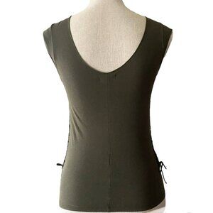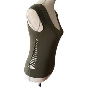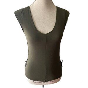 ZARA Sexy Military Green Stretchy T-Shirt. Size Medium, will fit small. Fabric: cotton and elastane. Features side slits and deep v-neck. Very good condition. Looks great with jeans, shorts or skirts!