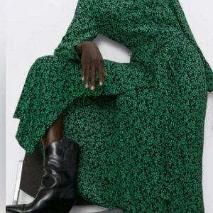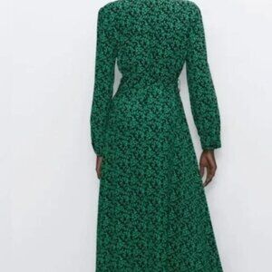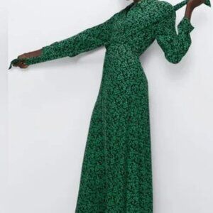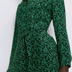 ZARA Shirt Dress Long Sleeve XL Black Green leaf print belt button down