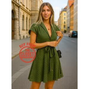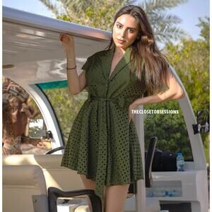 Green mini dress with lapel collar and short sleeves. Tied self belt. Embroidered eyelet detail. Tonal matching inner lining. Front embossed metal button closure. From ZARA, in size L. New with tags. Sold out in stores.