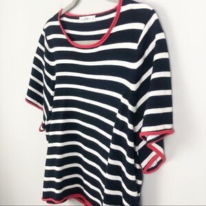 Super cute short sleeve sweater by Zara Knit. Navy blue base with white stripes and an orangey red trim on collar, cuffs, and hem. Lightweight soft material. Perfect for any day or night - especially July 4th, Memorial Weekend, or Labor Day. Great condition! Size Medium.