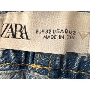These ZARA size 0 jeans features a comfortable elastic waistband and a wide leg fit, suitable for casual wear. Crafted from 100% lyocell, they offer a soft and breathable feel. elastic waist, light denim, wide leg, jeans, casual wear, lyocell, soft feel, breathable, frayed hem, Size 0, School, travel