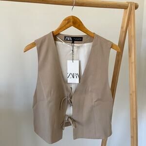 ZARA Sleeveless Linen Vest NWT | Beige Beaded Tie-Front Top Size L