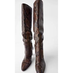 ZARA Snakeskin Print Knee High Boots Block Heel Brown Faux Leather Size US 7.5