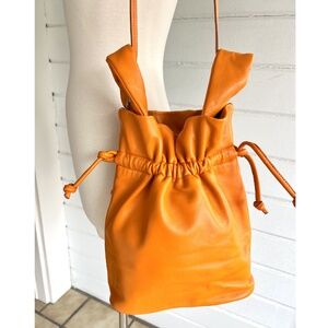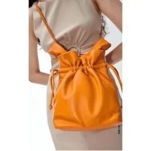 ZARA Soft Leather Drawstring Bucket Bag with Shoulder Strap in Orange