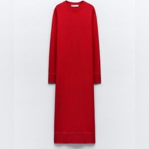 This Zara dress features a striking red hue and a classic crew neckline, perfect for both work and casual settings. Its long sleeves and sheath style offer a sleek and polished look, making it a versatile addition to any wardrobe.