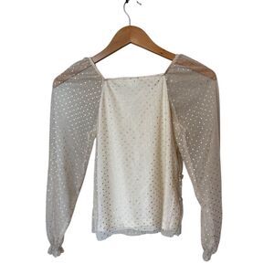 Cute top with a square neck, long sheer sleeves, gold polka dots, and ruffled/smocked detailing. The metallic polka dots give it a sparkly appearance. Perfect for the holidays.