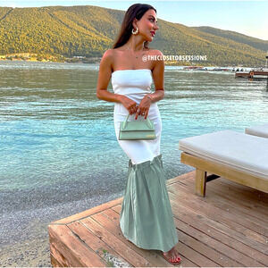 White/green strapless midi dress. Contrast pleated fabric appliqué. From ZARA, in size M and L. New with tags. Sold out in stores.
