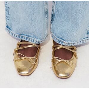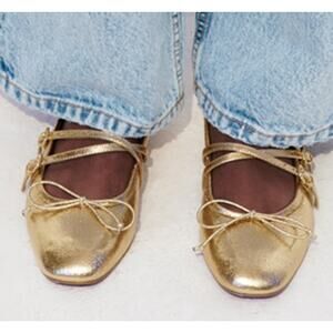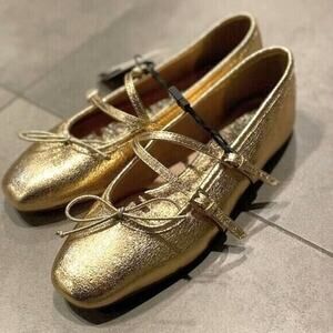 Gold flat Mary Janes with metallic effect. Thin straps with buckles. Bow detail at front.