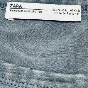 ZARA Basics ~ Women's size Large bodycon dress in grey/blue. Side cut-out with silver metal clasp. Round neck. Short sleeves. Knee length. Super stretchy. Casual, t-shirt-like dress.