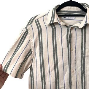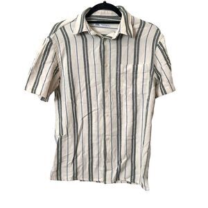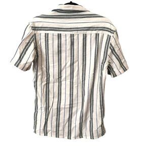 White/green/blue striped button-down. Front slit pocket. Cotton, poly, viscose blend - light flannel material. Great preloved condition. Size small