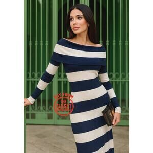 This chic navy + white striped knit midi dress features an off-the-shoulder foldover neckline, long sleeves, and a sleek A-line silhouette. Effortlessly elegant and perfect for vacation looks, coastal vibes, brunches, and elevated everyday outfits.